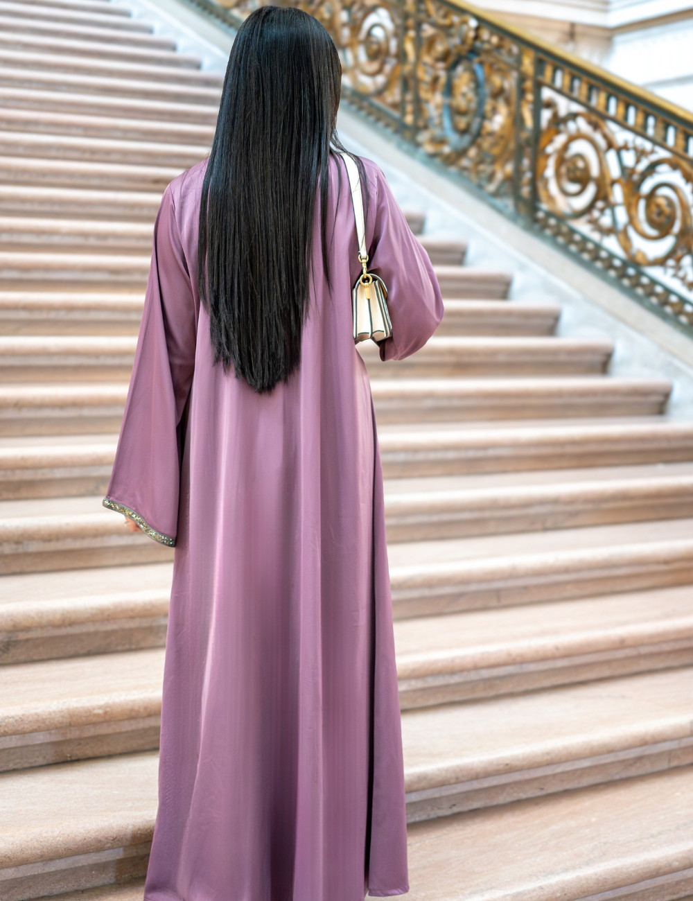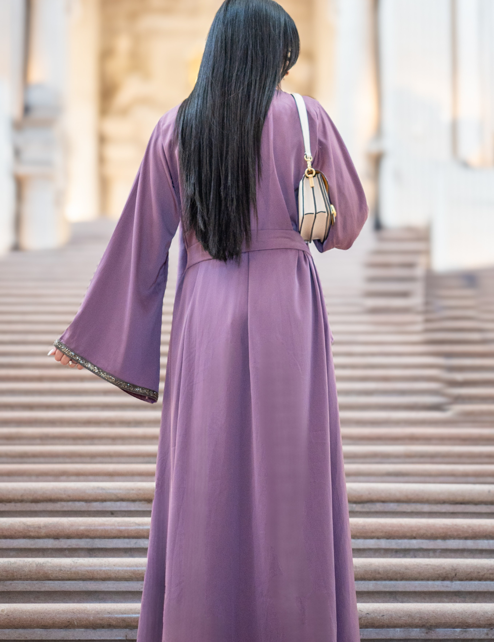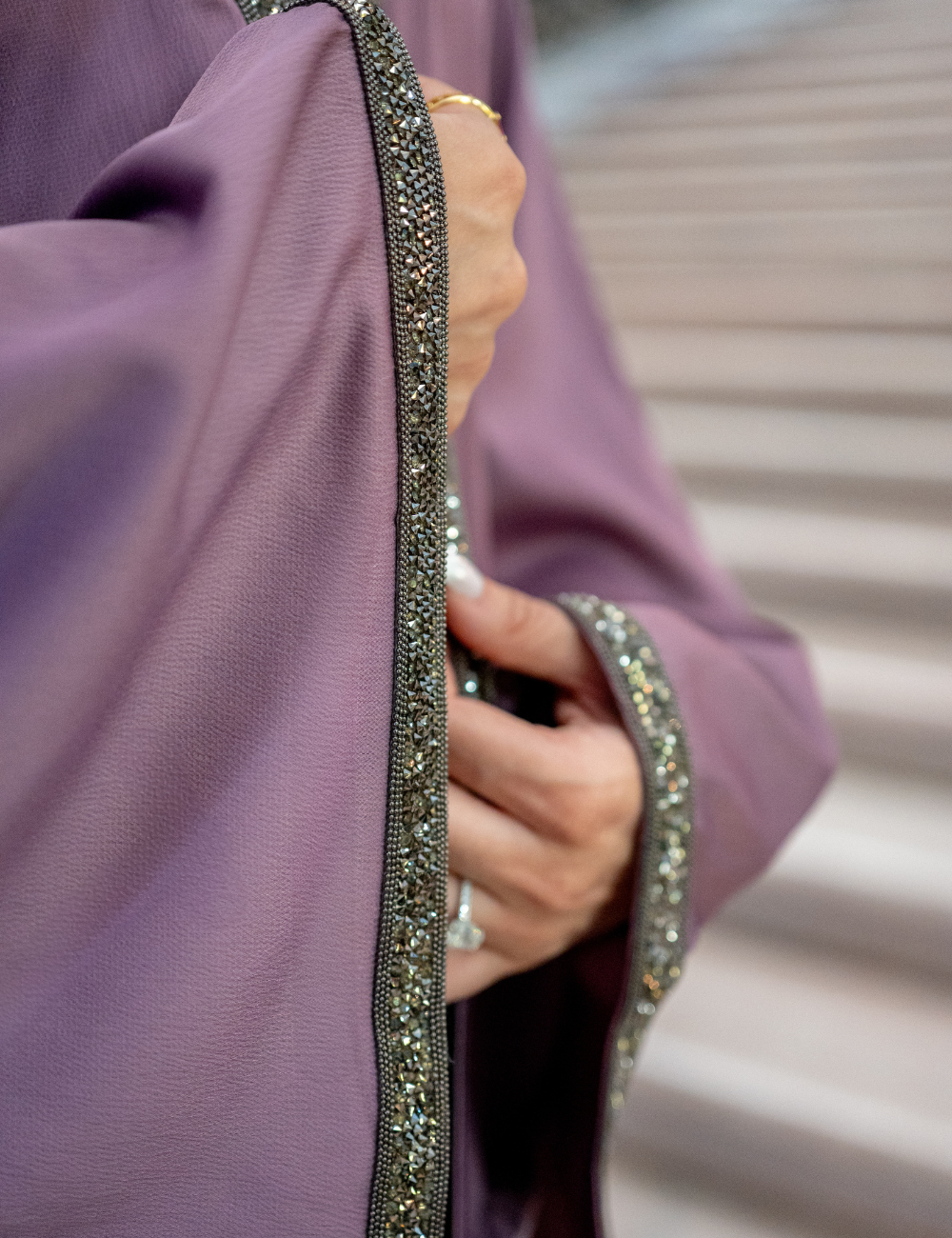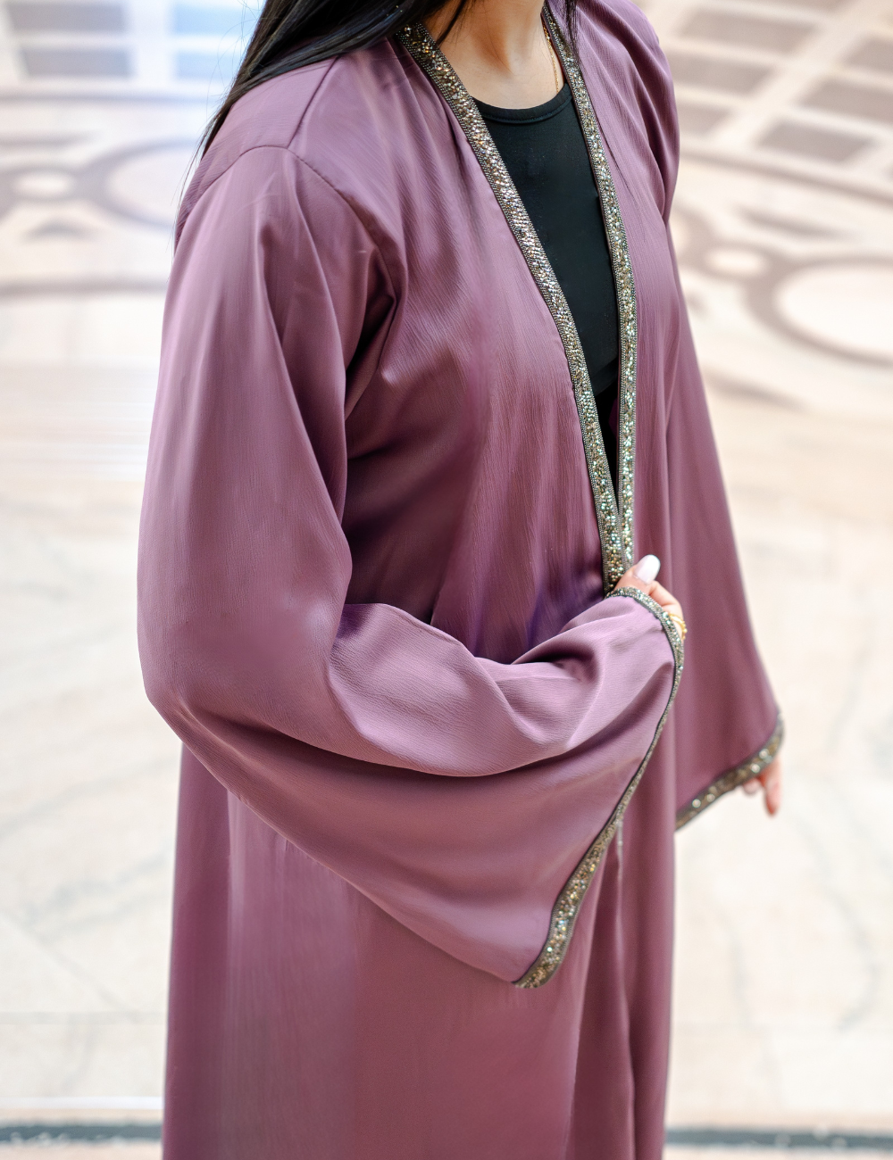 This abaya combines sumptuous softness with a weight of exquisite detail, crafted from a fabric that drapes elegantly yet commands presence. From top to hem, delicate crystal trace the borders, extending along the sleeves to create a shimmering glide with every movement. Flowing softness meets subtle radiance, turning the garment into a moving poem of refined artistry. Endlessly luminous and captivating, every detail speaks in whispers of timeless refinement.