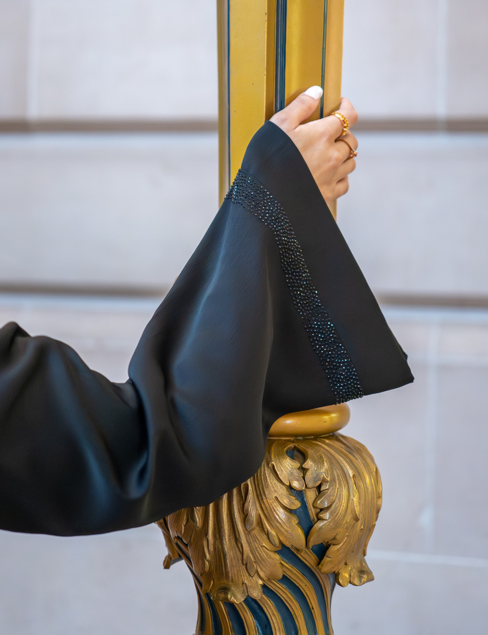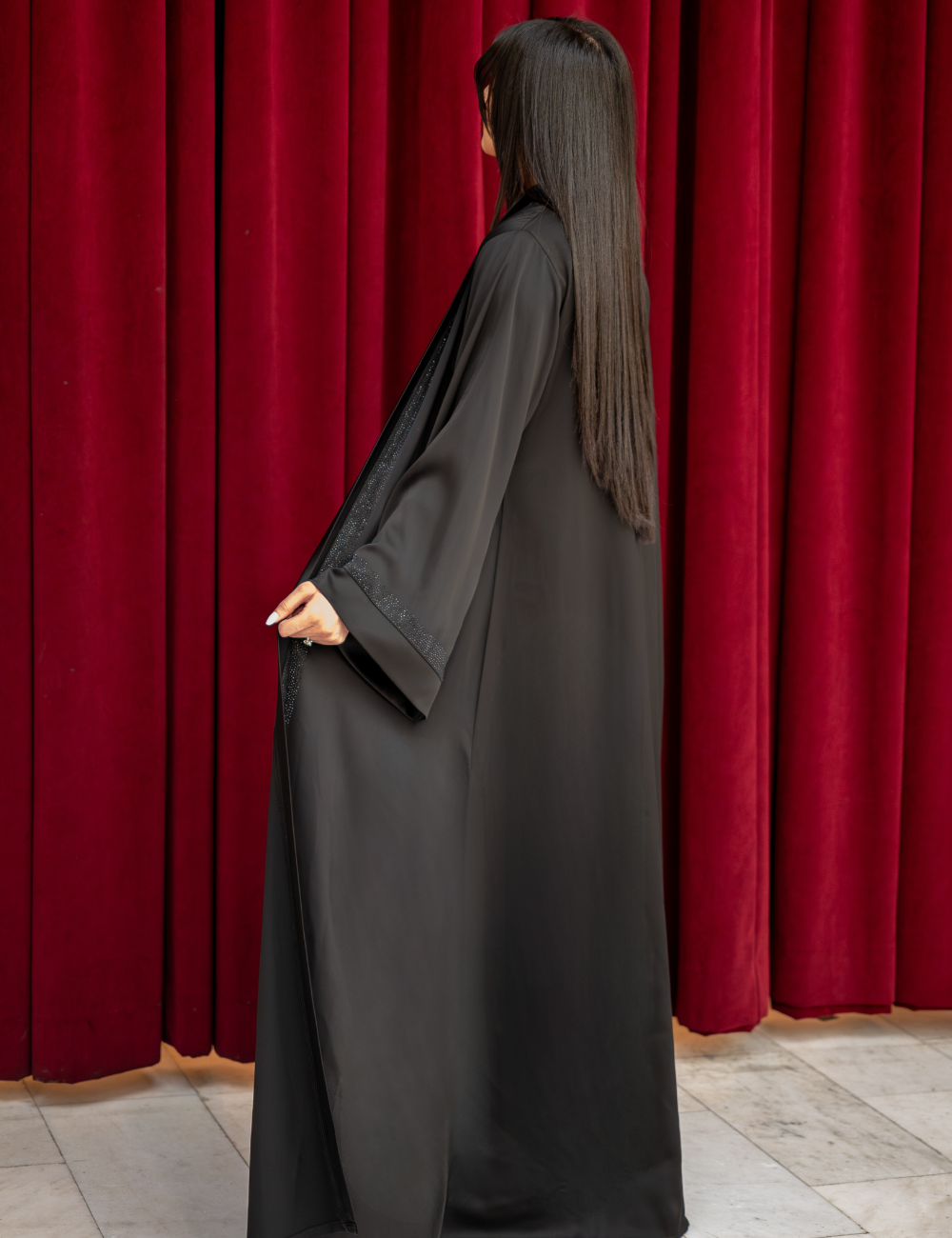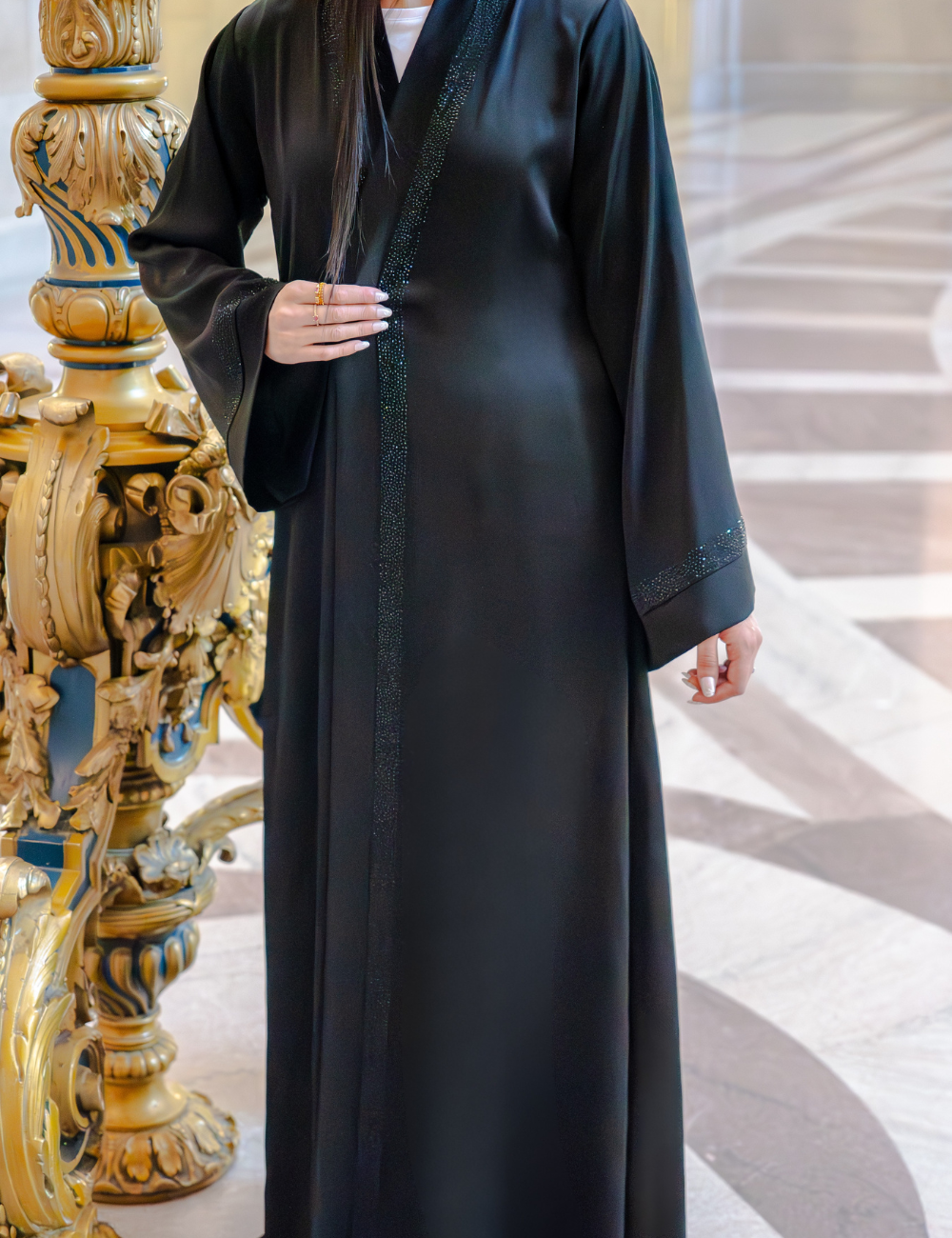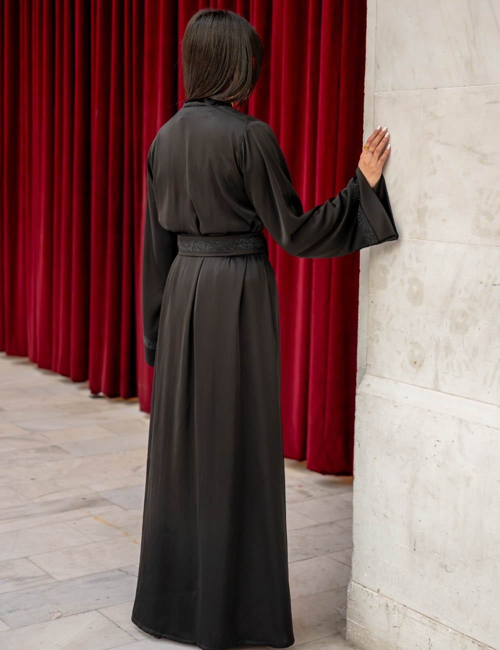 Elegance redefined in every detail, this all black abaya is a delicate symphony of sophistication. Silky lightweight fabric cascades effortlessly, creating a graceful flow that moves with you. A belt fully adorned with crystals, captures the light with radiant sparkles echoed by delicate crystal embellishments along the sleeves. Its clean lines transform into a shimmering vision as light dances across its surface.